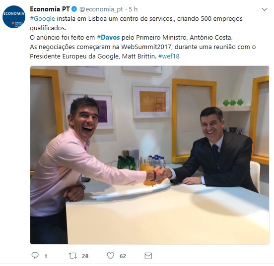 A prosperidade de Portugal não é só medida pelo nível de investimento e pelo crescimento económico alcançado até aqui, mas pelo potencial que consegue gerar. O Primeiro Ministro, António Costa, procurou que essa mensagem ficasse bem clara durante a sua intervenção no Fórum Económico Mundial de Davos, na Suíça. Na conferência com o título «Porquê Portugal, porquê agora?», em que também participaram os Ministros das Finanças e da Economia, António Costa anunciou que Portugal continua no radar dos investidores internacionais, mais concretamente das grandes tecnológicas, e anunciou que a Google é a multinacional que se segue no mapa de centros de serviços detidos por multinacionais a operar em Portugal.